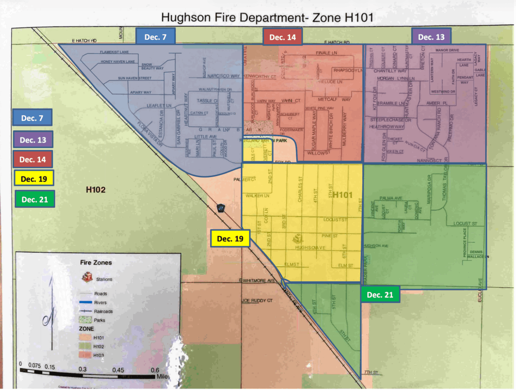 Hughson, Elm, Locust (west of 7th), Pine (west of 7th), 1st, 2nd, 3rd, 4th (north of Whitmore), 5th (north of Whitmore), 6th (north of Whitmore), 7th (south of Fox and north of Whitmore), Walker, Palmer, Cole, Everett, Charles St (south of Fox).